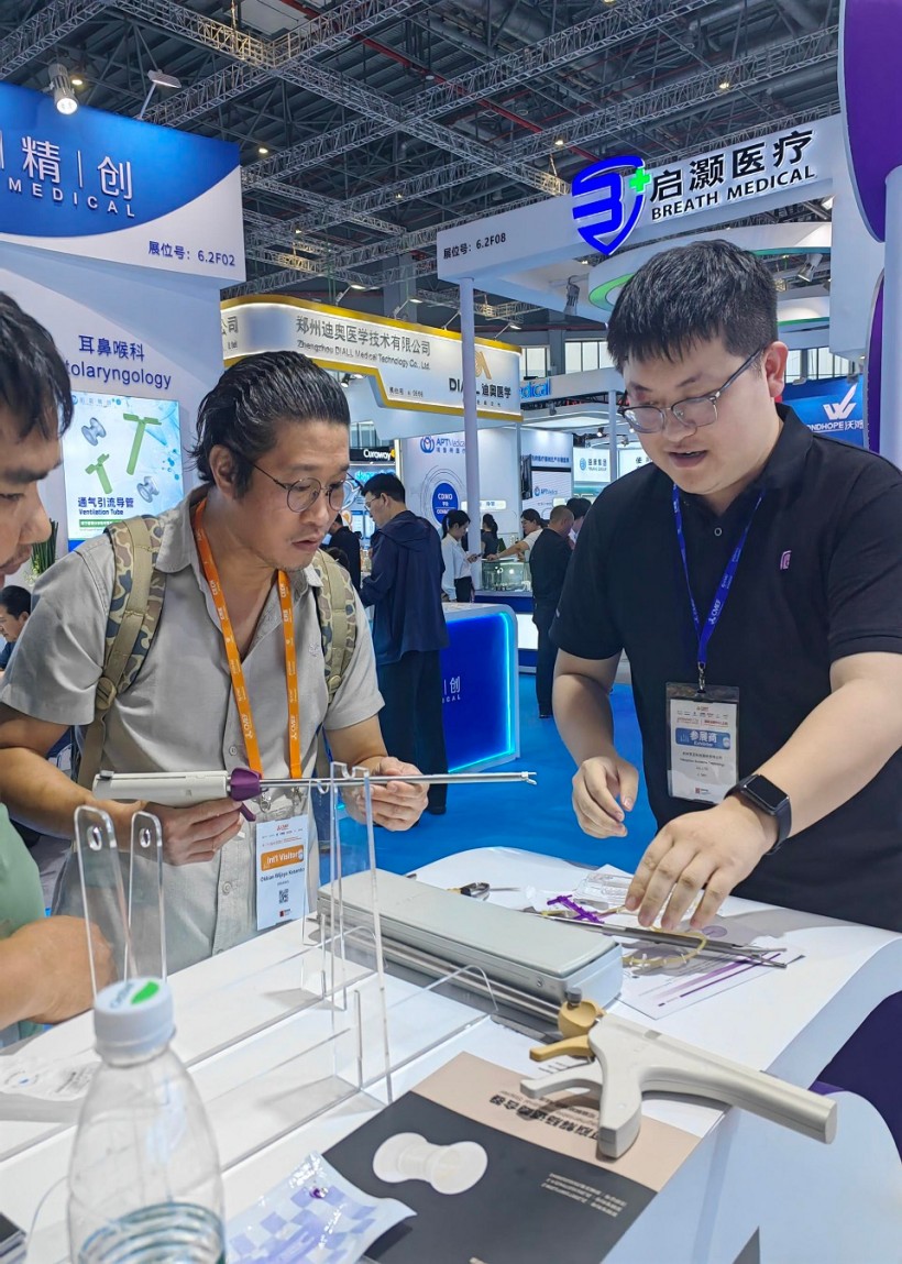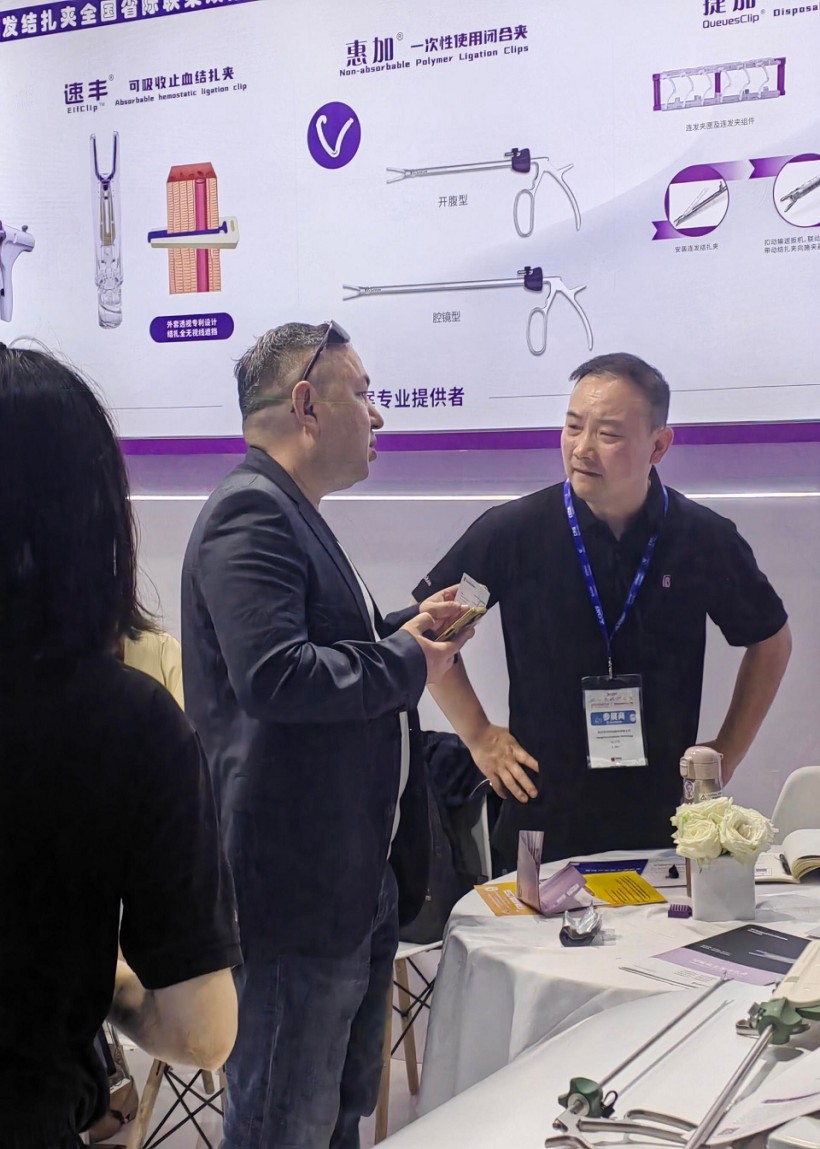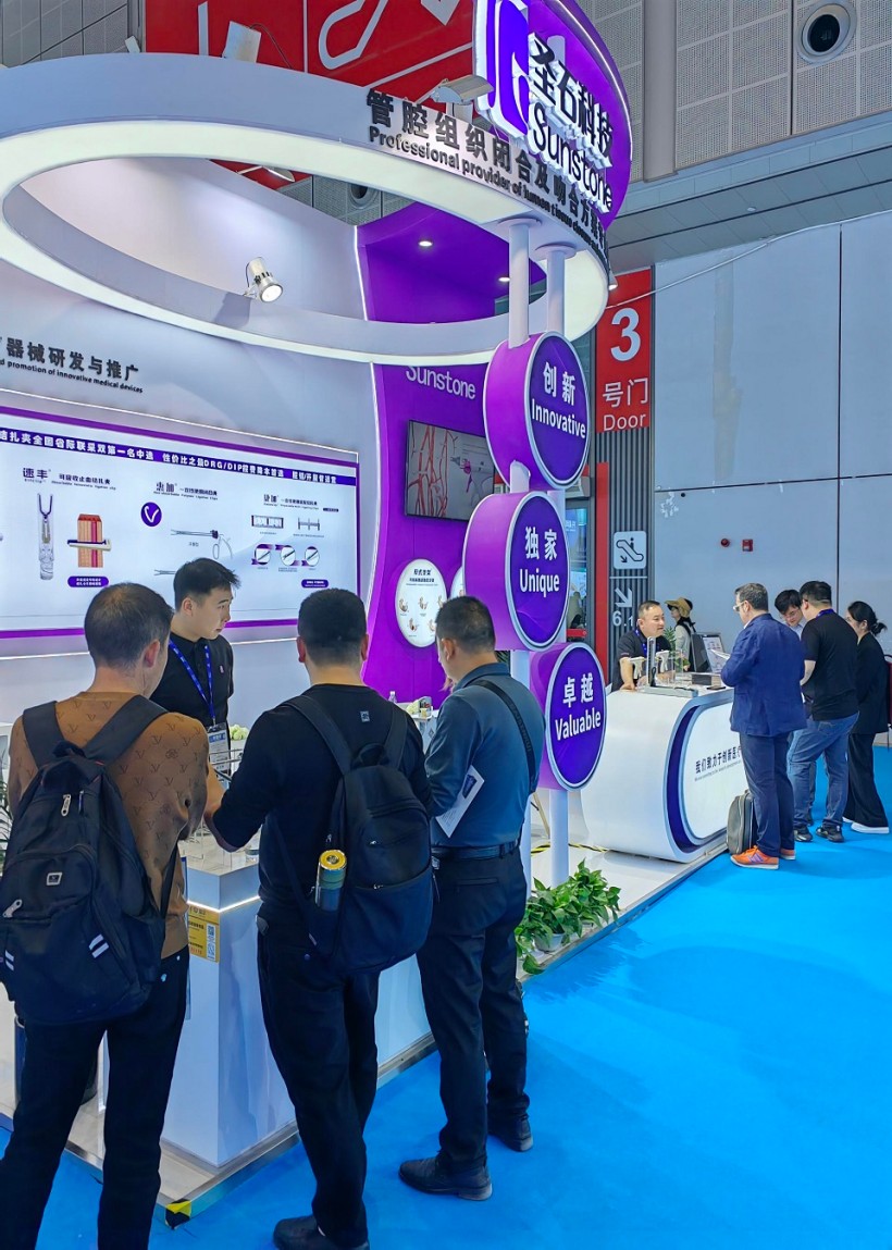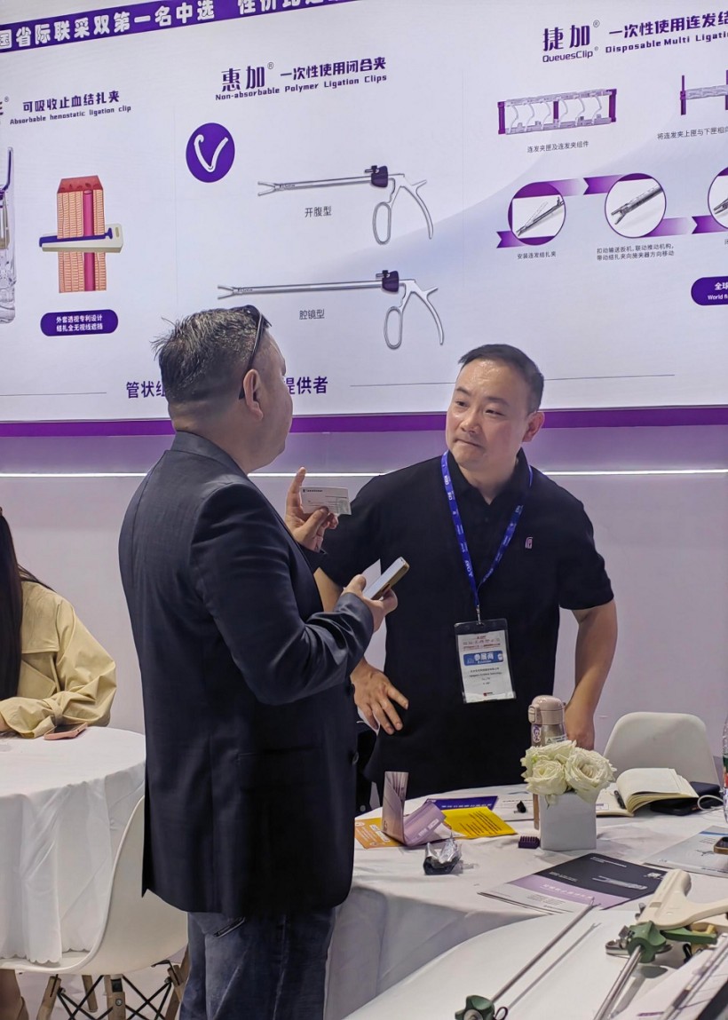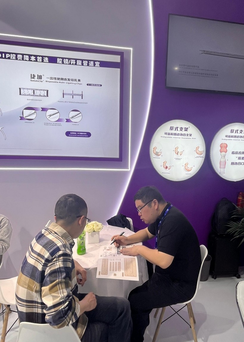 圣石同期展示的独创产品又一次聚焦了众人目光。全球首创捷加?一次性使用连发结扎夹及配套捷施?连发施夹钳,其独特的可重复使用连发钳专利设计,以及“2-6枚的连发夹灵活选装”专利技术不仅降低耗材使用成本,更通过流畅的操控性适配腔镜复杂场景需求。圣石与浙大邵逸夫医院联合研制,可应用于肠道吻合与转流的创新产品蔡式支架?“可崩解肠道吻合器”使此项全球创新术式配套产品具有吻合时间短、无永久残留异物、不破坏吻合口粘膜下血管,并能预防吻合口漏、可避免人工肛门及二次手术、治疗周期缩短、减少患者生理心理创伤等多项临床优势。